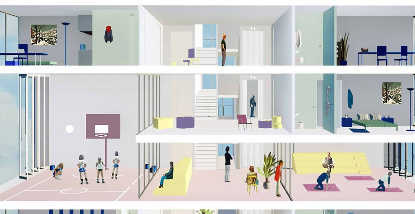 Et ce beau projet propose non seulement des logements, mais aussi des espaces sportifs, des salles communes pour étudier, des cuisines partagées et tout un tas d’espaces qui permettent de lutter contre l’isolement.