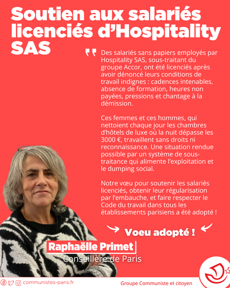 Avec ce vœu, nous proposons que la Ville de Paris apporte un soutien clair et concret à ces salariés, qu’elle se mobilise pour obtenir leur régularisation par l’embauche, et qu’elle exige de l’entreprise Hospitality SAS le respect strict du Code du travail. Car derrière cette lutte, il y a des femmes et des hommes qui ne réclament rien d’autre que des droits élémentaires et la reconnaissance de leur dignité de travailleurs