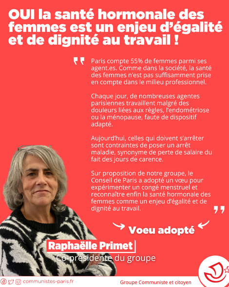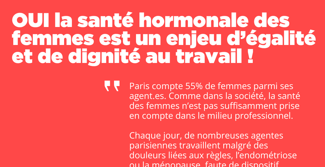 À Paris, où près de 55 % des agents municipaux sont des femmes et où près de la moitié des agents ont plus de 50 ans, la question se pose avec une acuité particulière. Pourtant, trop d’agentes concernées affrontent encore ces difficultés dans le silence, sans dispositifs adaptés et au prix parfois d’arrêts maladie qui entraînent une perte de salaire du fait des jours de carence.